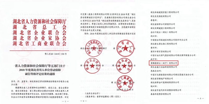 近日,經(jīng)湖北省人力資源和社會(huì)保障廳等五部門(mén)評(píng)定,黃鶴樓酒業(yè)(咸寧)有限公司被授予“2018年度湖北省用人單位勞動(dòng)保障誠(chéng)信示范單位”稱號(hào)。