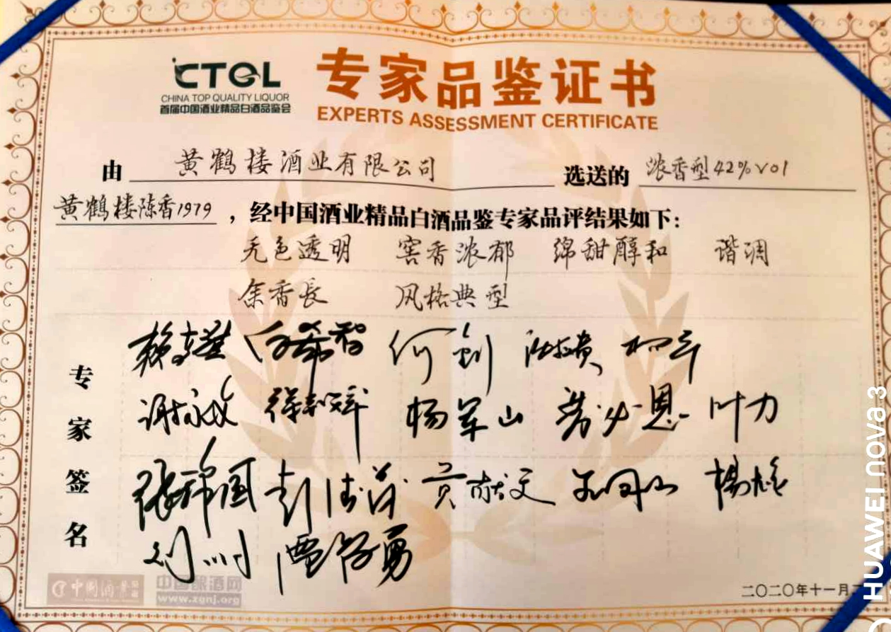 11月2日,首屆中國(guó)酒業(yè)精品白酒品鑒會(huì)在陜西西安召開(kāi),中國(guó)著名白酒專(zhuān)家賴(lài)高淮、白希智、何釗、丁易初、謝義貴、賈智勇、楊平、劉明、楊大金、王鳳仙、謝永文、葉力、徐欽祥、貢獻(xiàn)文、普必恩、趙德義、楊軍山、張鋒國(guó)共計(jì)18位名酒品鑒專(zhuān)家參加活動(dòng)?;顒?dòng)遴選出20款精品白酒并頒發(fā)專(zhuān)家品鑒證書(shū),黃鶴樓酒•陳香1979名列其中,并以其 “無(wú)色透明、窖香濃郁、綿甜醇和、諧調(diào)、余香長(zhǎng)、風(fēng)格典型”的特點(diǎn)獲得品鑒專(zhuān)家們高度評(píng)價(jià)。