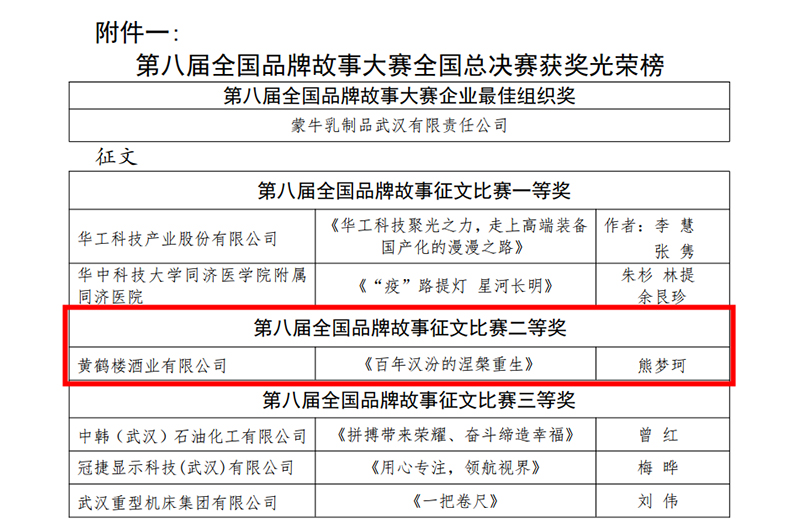 近日,黃鶴樓酒業(yè)在第八屆全國品牌故事大賽與質量管理小組活動中取得優(yōu)秀成績。作品《百年漢汾的涅槃重生》榮獲“第八屆全國品牌故事大賽征文比賽二等獎”和“武漢賽區(qū)征文比賽二等獎”。