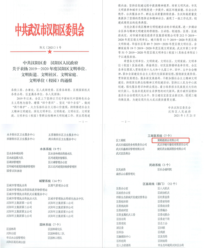 新年伊始喜訊傳,1月21日黃鶴樓酒業(yè)被中共武漢市漢陽區(qū)委員會(huì)授予“2019-2020年度區(qū)級(jí)文明單位”榮譽(yù)稱號(hào)。