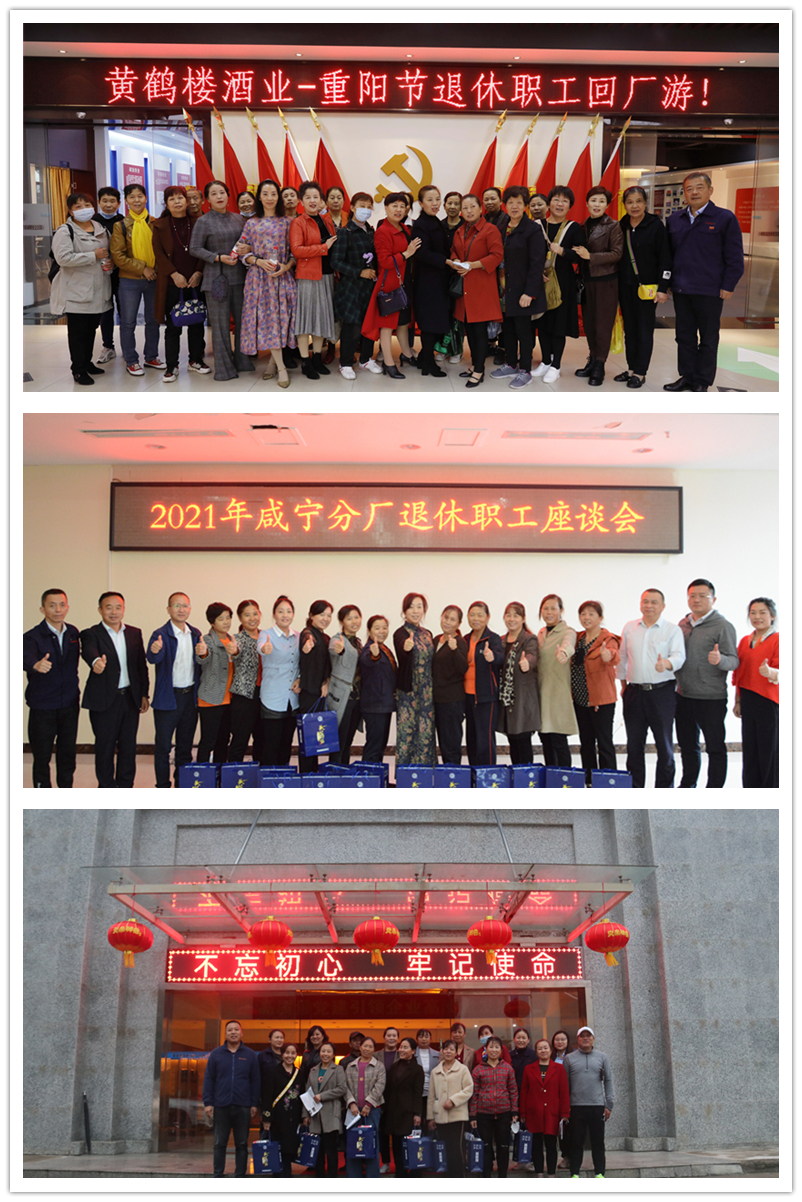 三地回廠活動(dòng)形式多樣。武漢組織回廠游,帶領(lǐng)老員工們重溫故地,把酒言歡。咸寧、隨州開(kāi)展座談會(huì),了解退休職工生活現(xiàn)狀并介紹公司目前的發(fā)展形勢(shì),送上佳節(jié)祝福與禮品,組織觀看企業(yè)宣傳片,暢談黃鶴樓酒業(yè)未來(lái)發(fā)展新藍(lán)圖。