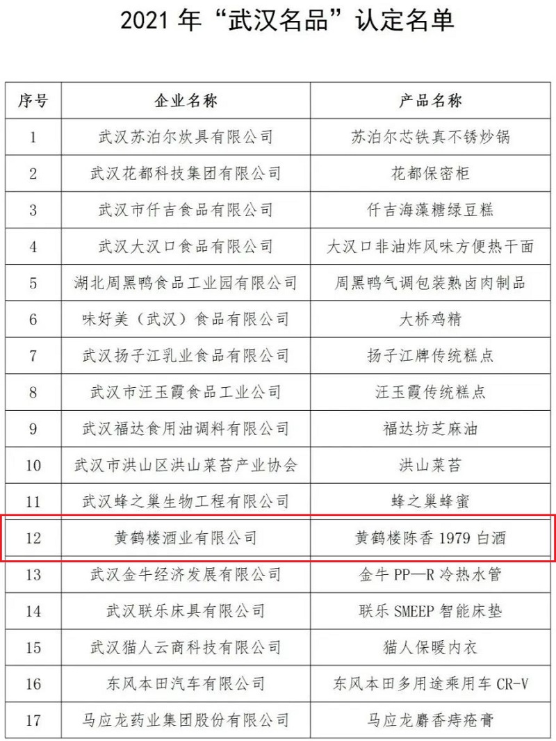 3月24日,2021年“武漢名品”認定名單公布,黃鶴樓酒業(yè)“黃鶴樓陳香1979”榜上有名。