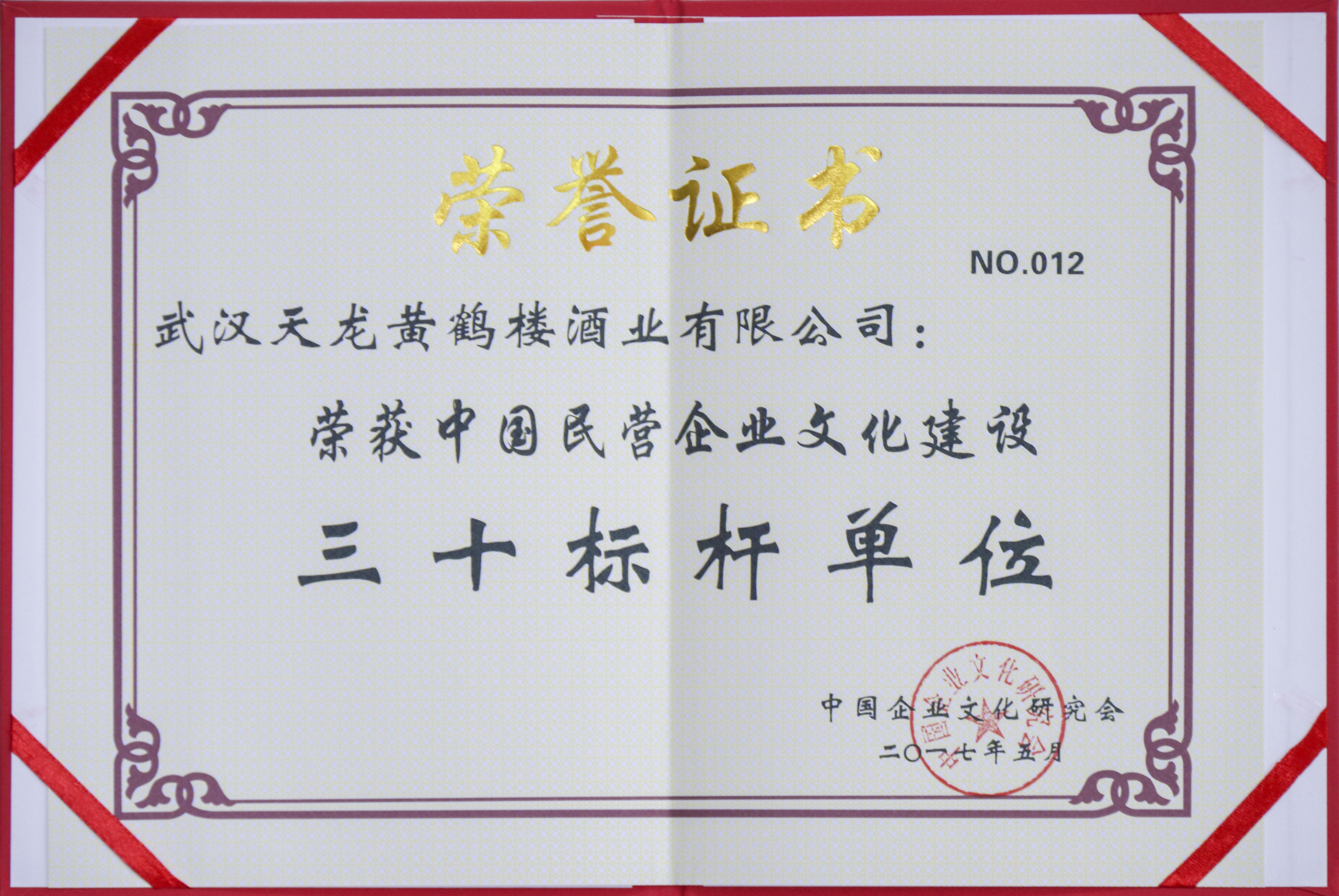 在中國民營企業(yè)文化建設(shè)總結(jié)表彰儀式上,武漢天龍黃鶴樓酒業(yè)有限公司榮獲“中國民營企業(yè)文化建設(shè)三十標(biāo)桿單位”稱號,公司董事長許鵬榮獲“中國民營企業(yè)文化建設(shè)先進(jìn)個人”稱號。