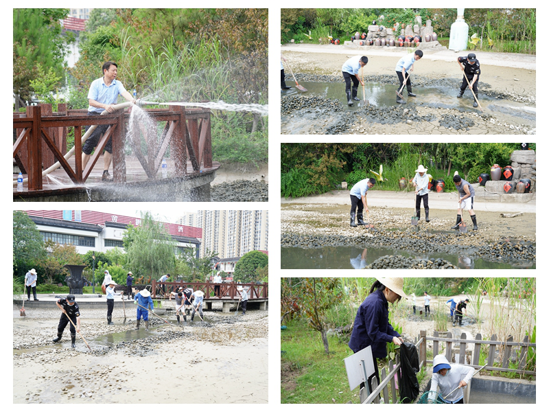 烈日下,大家換上膠鞋、手執(zhí)鐵鍬走進(jìn)小花園池塘,齊心協(xié)力、揚(yáng)鍬鏟泥。兩個(gè)小時(shí)的勞作,眾人揮汗如雨、干勁滿滿,一鍬接一鍬將沉積花園池塘的淤泥徹底清理干凈。