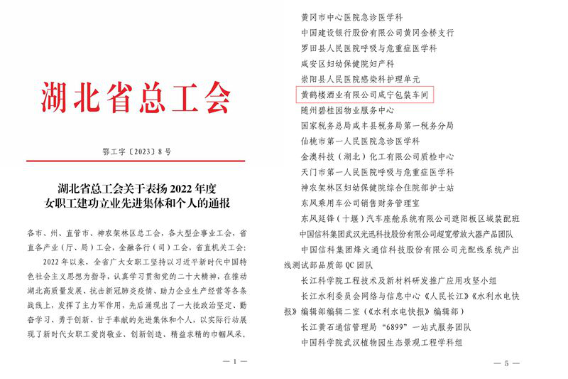 近日,湖北總工會表彰一批2022年度女職工建功立業(yè)先進(jìn)集體和個人,黃鶴樓酒業(yè)咸寧包裝車間喜獲“湖北省女職工建功立業(yè)標(biāo)兵崗”榮譽(yù)稱號。