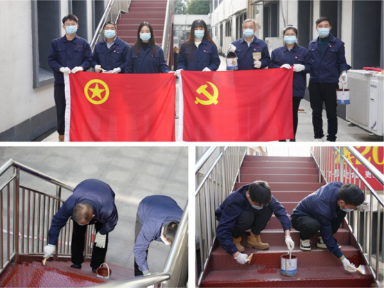 活動中,各黨員、積極分子輕裝上陣,挽起袖子、戴上手套,做好個人防護,化身“油漆工”,對武漢廠區(qū)辦公樓1號會議室出口樓梯及樓梯側面進行全面重新刷漆,大家齊心協(xié)力、分工合作,辦公樓樓梯煥然一新。