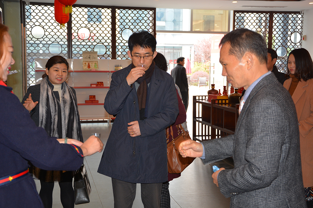 崔烓東與咸寧市外僑辦、閔波平廠長合影留念,表示將把黃鶴樓酒推向韓國,促進中韓兩國酒文化交流更上層樓。