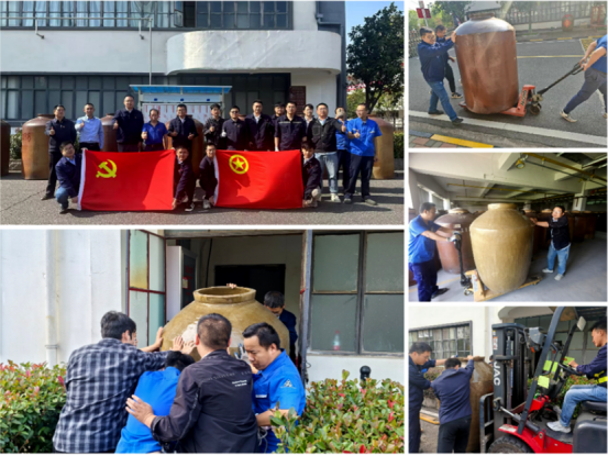 在轉(zhuǎn)移過程中,面對體型龐大、重量驚人的大陶壇,大家團(tuán)結(jié)協(xié)作,采取科學(xué)高效的分組分工方式,確保搬運(yùn)過程安全有序進(jìn)行。經(jīng)過數(shù)小時(shí)的不懈奮戰(zhàn),33個(gè)噸位級大陶壇被順利搬運(yùn)到廠區(qū)指定區(qū)域,并進(jìn)行了景觀設(shè)計(jì),為武漢廠區(qū)增添了一道亮麗的風(fēng)景線。