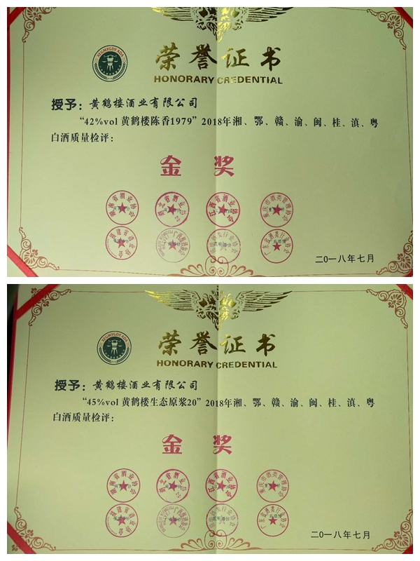 近日,在福建省福州市羅源縣舉行的第十屆“閩湘鄂贛渝桂滇粵酒類質(zhì)量檢評交流會(huì)”上,黃鶴樓酒業(yè)的“45度黃鶴樓生態(tài)原漿20”、“42度黃鶴樓陳香1979”獲評金獎(jiǎng)產(chǎn)品榮譽(yù)稱號(hào)。
