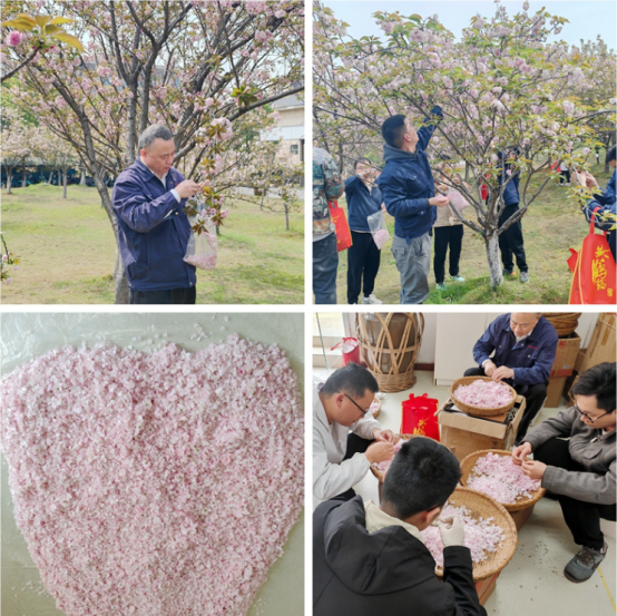 活動現(xiàn)場,技術(shù)質(zhì)量中心相關(guān)人員詳細(xì)介紹了花瓣分揀標(biāo)準(zhǔn)。隨后,10余名黨員進(jìn)行分組作業(yè),精心采摘,嚴(yán)格篩選出符合釀酒標(biāo)準(zhǔn)的優(yōu)質(zhì)花瓣,把好源頭原料關(guān),共采集10余斤優(yōu)質(zhì)櫻瓣。