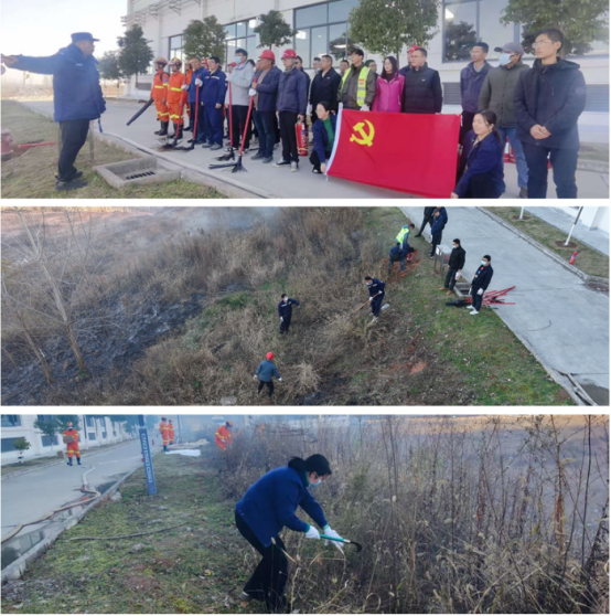 活動中,通過模擬由于野外用火管理不當導致火源擴散發(fā)生火災事故的場景,提升廠區(qū)消防應急救援能力,同時通過此次活動焚燒廠區(qū)未建設區(qū)域荒地雜草,緩解廠區(qū)冬季山火險情壓力。按照預設活動方案,隨州黨支部組織黨員、義務救援隊員迅速分為警戒組、救援組、疏散組協(xié)同處置,積極參與活動,圓滿完成既定任務。