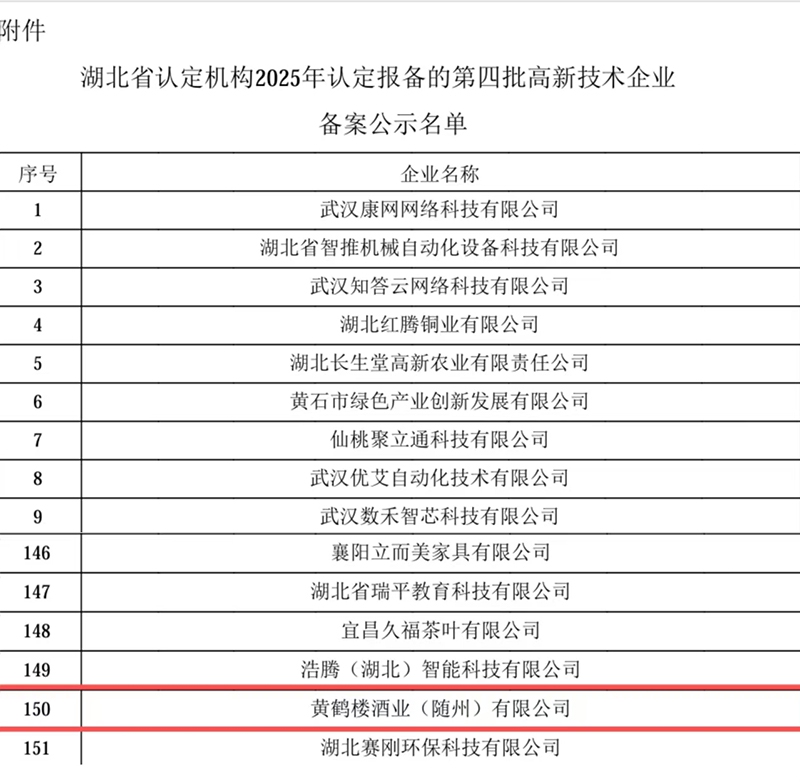 近日,湖北省認(rèn)定機(jī)構(gòu)發(fā)布《關(guān)于對2025年認(rèn)定報(bào)備的第四批高新技術(shù)企業(yè)進(jìn)行備案的公示》,黃鶴樓酒業(yè)(隨州)有限公司成功入選第四批高新技術(shù)企業(yè)備案公示名單。