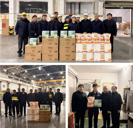 慰問中,魏國一行來到包裝車間、釀造車間和酒庫,與正在夜間加班的職工親切交流,詳細(xì)了解了生產(chǎn)安排、值班值守及后勤保障情況,并送去牛奶、蛋糕等慰問品。