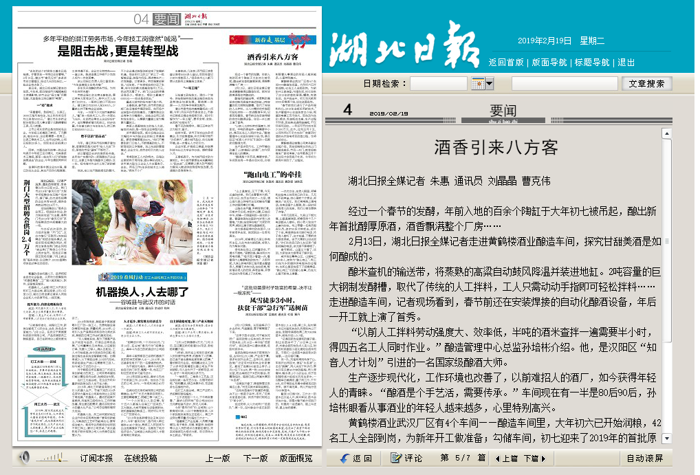 黃鶴樓酒業(yè)武漢廠區(qū)有4個(gè)車間——釀造車間里,大年初六已開始潤糧,42名工人全部到崗,為新年開工做準(zhǔn)備;勾儲(chǔ)車間,初七迎來了2019年的首批原酒;罐裝、包裝車間,生產(chǎn)線全開,初七當(dāng)天就有8000多箱酒下線,運(yùn)往全國各地。“春節(jié)前我們進(jìn)行了產(chǎn)品布局和優(yōu)化,2019年全部采用新技術(shù)。”生產(chǎn)管理中心總監(jiān)陳彥龍介紹,瓶蓋的電鍍工藝污染大,現(xiàn)在改為絲印、噴涂,乳玻瓶成本高、生產(chǎn)過程不環(huán)保,現(xiàn)在換成透明玻璃瓶,不僅環(huán)??苫厥?,一年還可節(jié)約成本至少300萬元。此外,過完正月十五,公司利用2萬平方米的廠房屋頂打造的光伏發(fā)電項(xiàng)目改造工程,也將正式動(dòng)工。